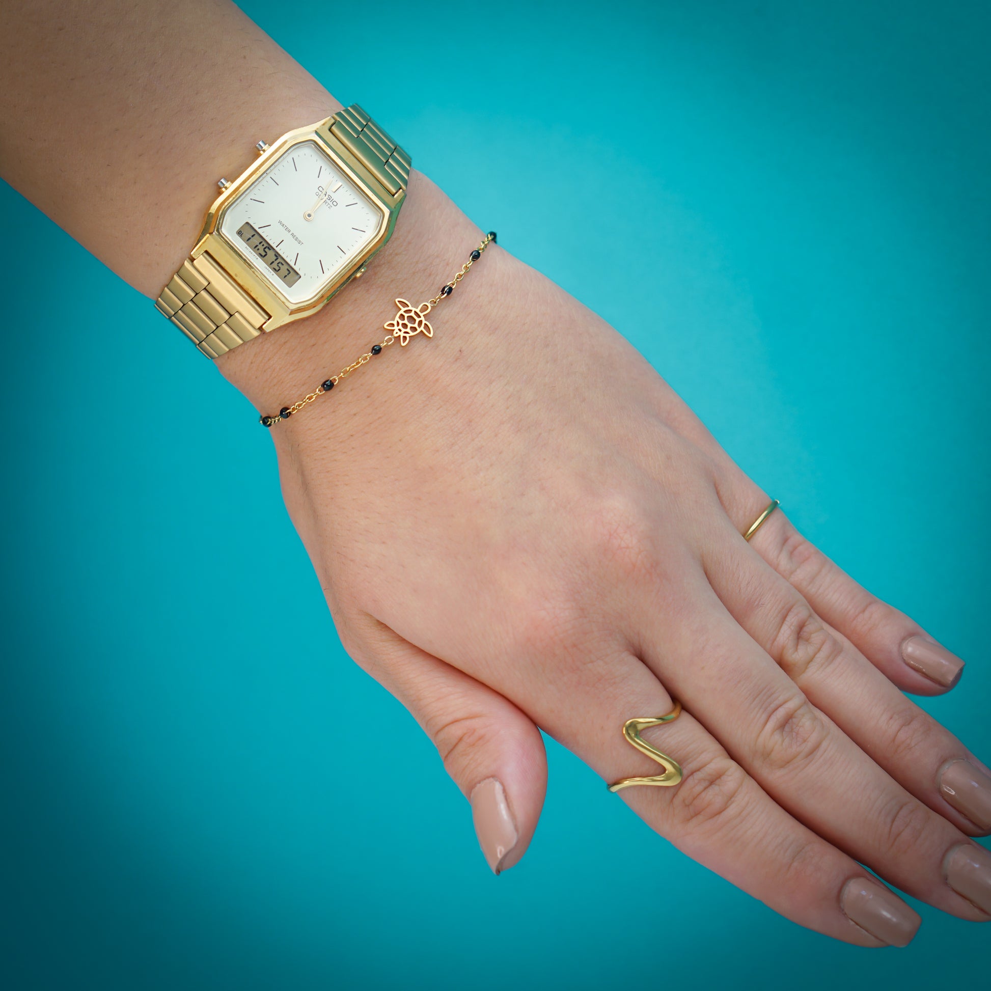 Add a touch of cuteness to your wrist with our Black Beads Turtle Bracelet. The delicate black beads complement the adorable turtle charm, making it the perfect accessory for any outfit. Embrace your playful side with this unique bracelet!