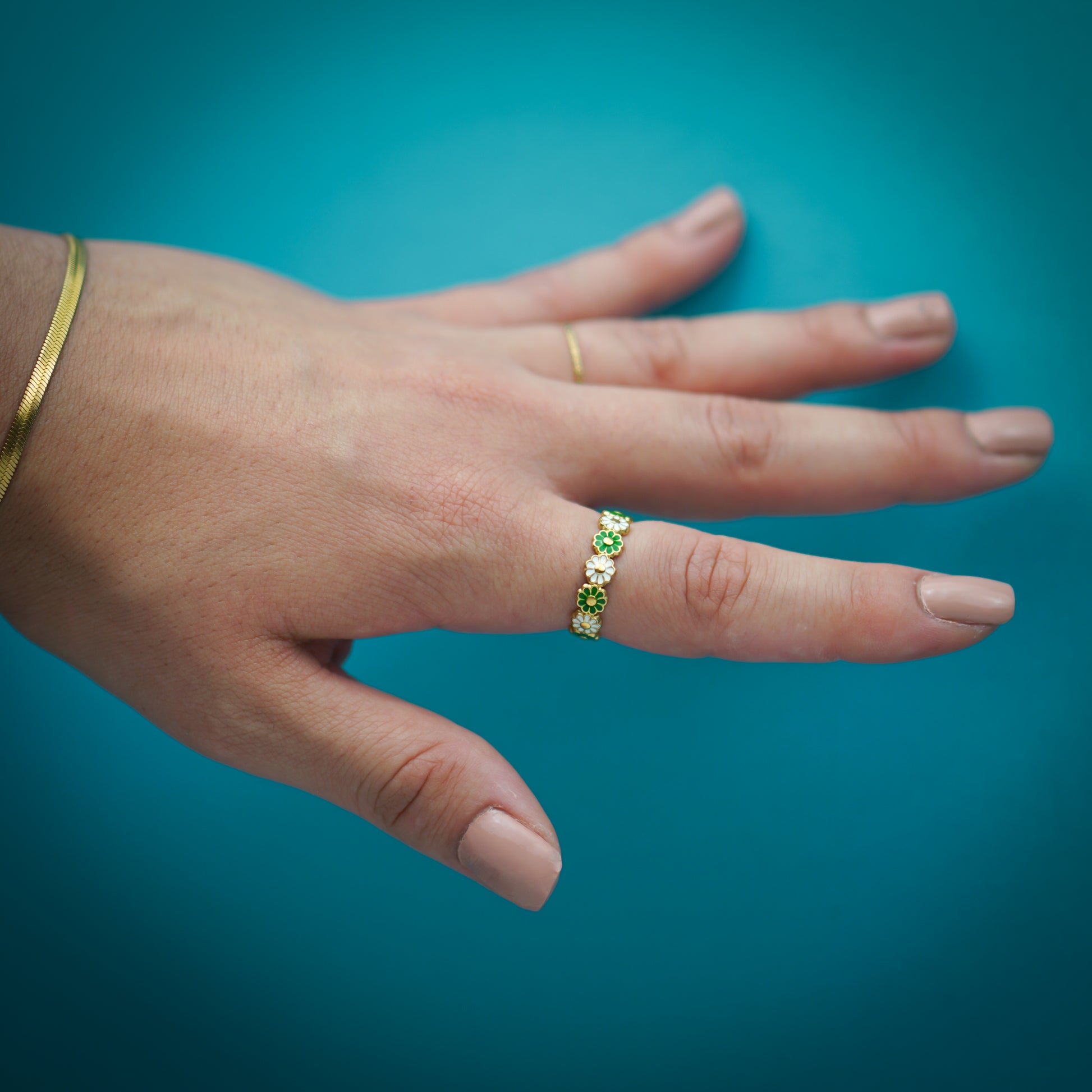 Experience the thrill of taking risks with our Brazilian Daisies Ring! Adorned with green and white daisies and a touch of gold, this adjustable ring is both cute and elegant. Don't be afraid to get it wet, as it is waterproof and tarnish-free. Take on any challenge with this daring accessory!