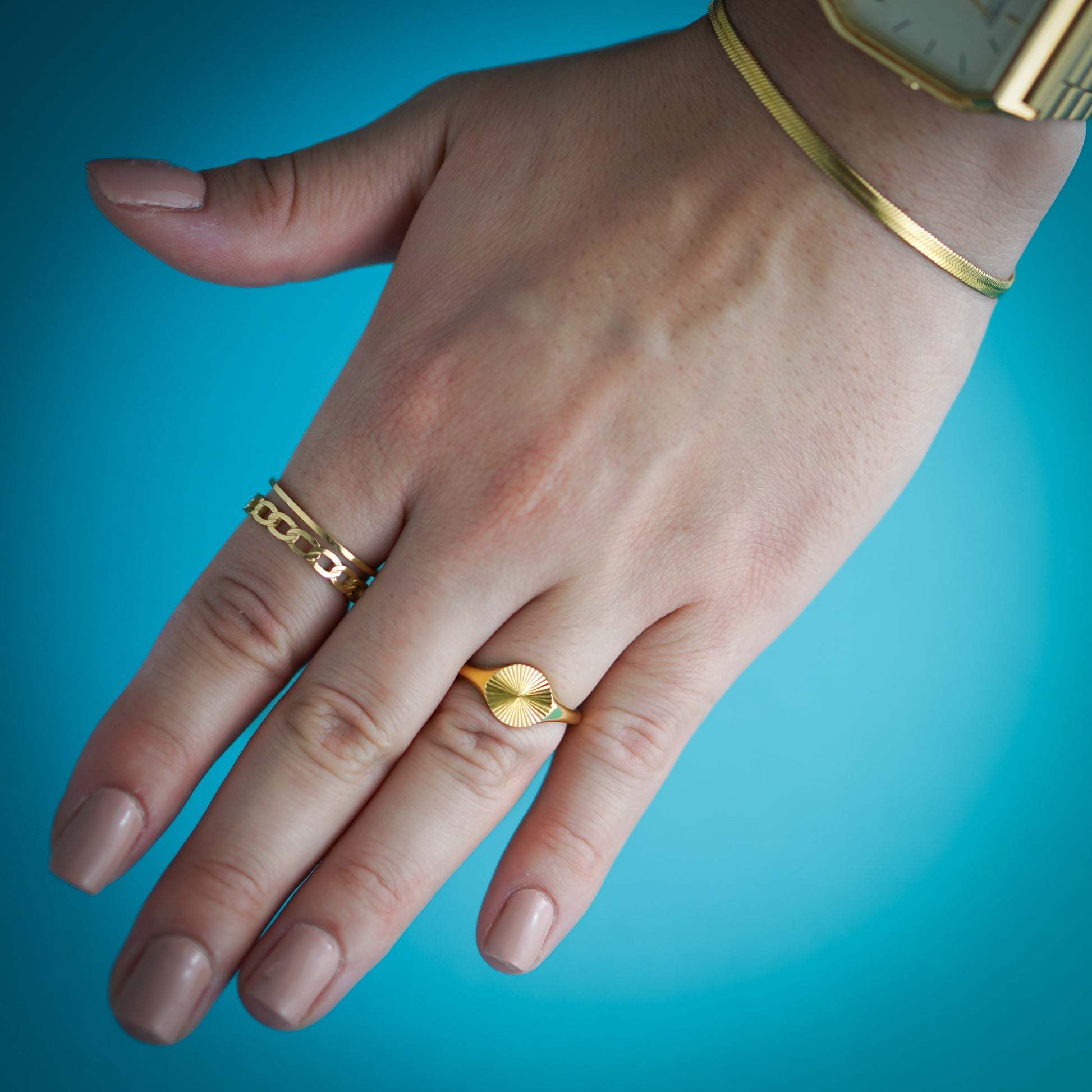 Transform your style with our Elegant Engraved Ring. The delicate sunshine rays engraved on the gold plated stainless steel ring add a touch of radiance to any outfit. Sparkle with sophistication and luxury.