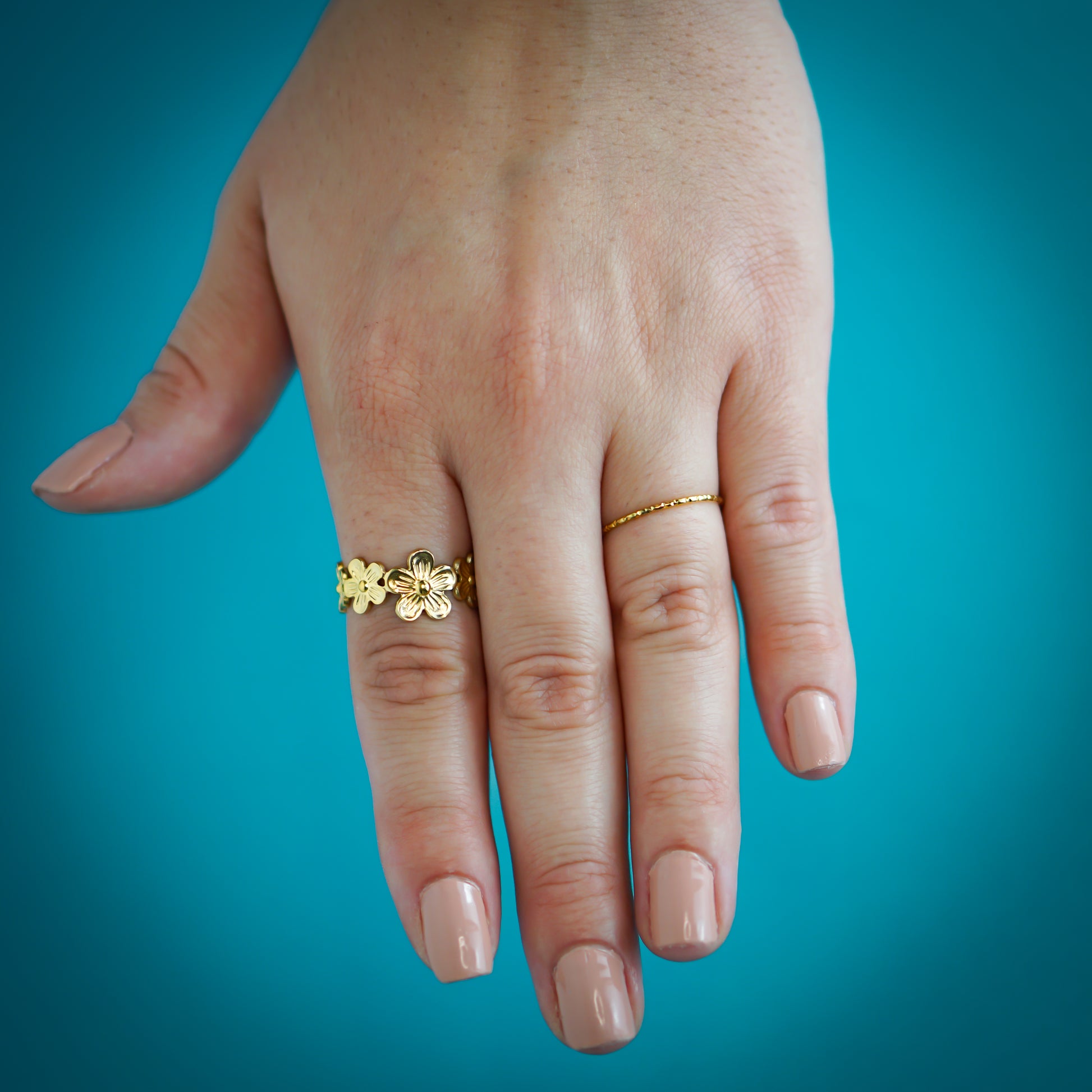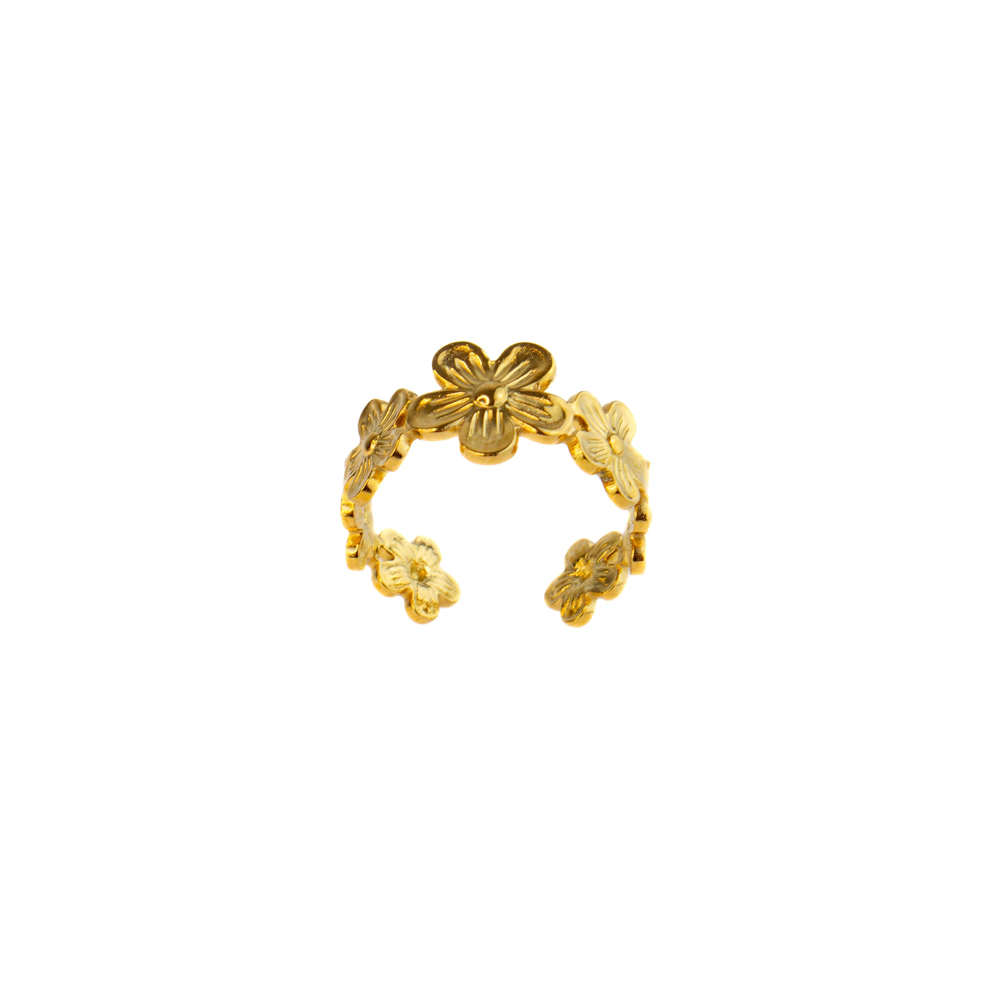 Introducing the Golden Flowers Ring, a delicate and feminine addition to your accessories collection. With intricate floral details and an adjustable size, this ring exudes elegance. Plus, it's waterproof and tarnish-free, ensuring long-lasting beauty. Elevate your style with this luxurious piece.